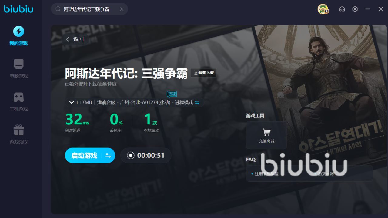 所以对于“阿斯达年代记三强争霸闪退怎么办”的问题,只需挂上一个biubiu加速器,网络不良问题就能迎刃而解。特别是阿斯达年代记三强争霸这种大型网游同时在线玩家众多,持久稳定的网络让你pk更有保障。