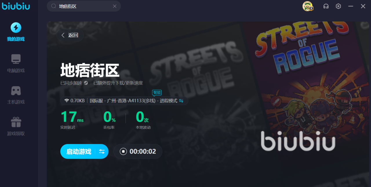 安装好biubiu加速器,使用方法也很简单,在首页搜索地痞街区游戏名字,搜索结果中直接点击游戏即可一键加速。玩家们可以看到加速页面,效果以数据的形式实时汇报给你,还可以实时在游戏内感受到明显变流畅的手感。