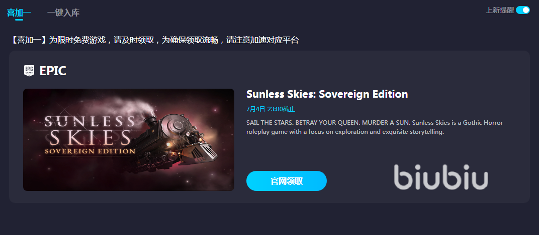 爱玩游戏的小伙伴不妨关注一下游戏领取,在这里有免费的游戏还有一键入库资源,免费游戏不定期更换,只要点击上新提醒就不怕错过了。第一次领取游戏不知道如何操作的小伙伴别着急,系统有详细的教程引导大家,保证让你把游戏收入囊中。