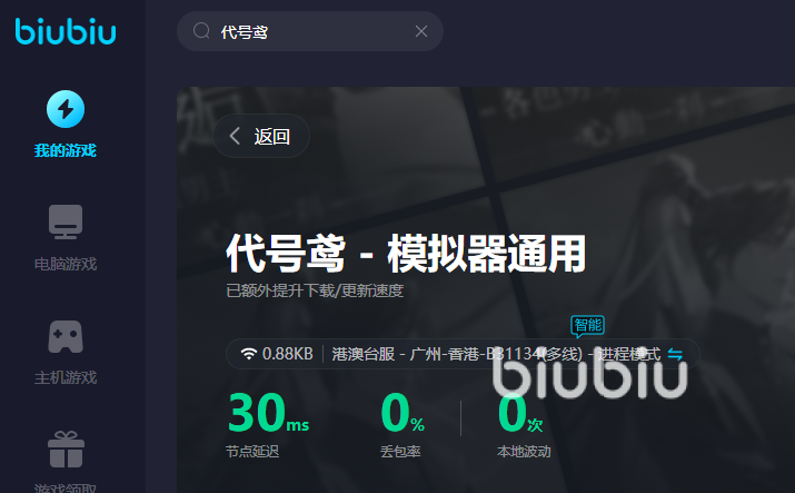 biubiu对于代号鸢模拟器也是提供加速服务的,只要通过名称查找,就可以在客户端快速的找到加速方式,整个操作都很便捷,两秒钟就可以完成了。如果还有其他喜欢的游戏,也可以在这里进行搜索哦,biubiu的游戏库很庞大,同样可以得到加速服务的。