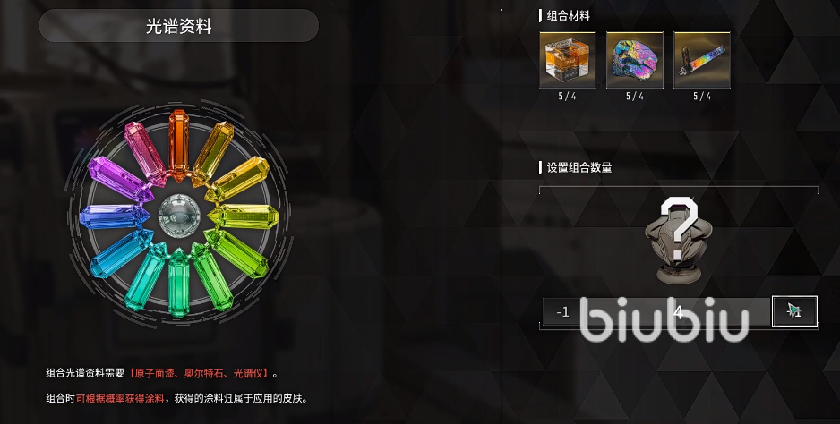 材料收集完成后系统会自动放入,接着大家点击组合,就会合成光谱资料结果,这里鼠标放上去就能看到组合出了什么颜色。