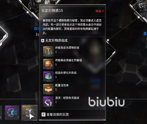 无定形物质打开后可以获得一些商城无法购买的材料,例如继承者的遗物套组、能量活性体等。这里开出物品的好坏和颜色有关,无定形物质一共有蓝、紫、黄三种颜色,其中蓝色品质最低,黄色品质最高,当然黄色的获取难度也很高。