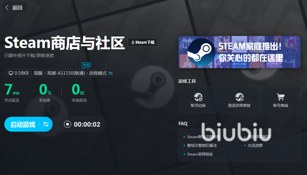 由于这款游戏是发布在steam上的,如果游戏平台卡顿,也是一样会影响我们的游戏进程的。想要加速网络就很简单,只需要打开biubiu的加速器,首页搜索steam即可立即加速,然后重启steam平台再进入游戏,就可以为游戏加速了、无论单机模式还是联机模式,都可以轻松享受丝滑网络。