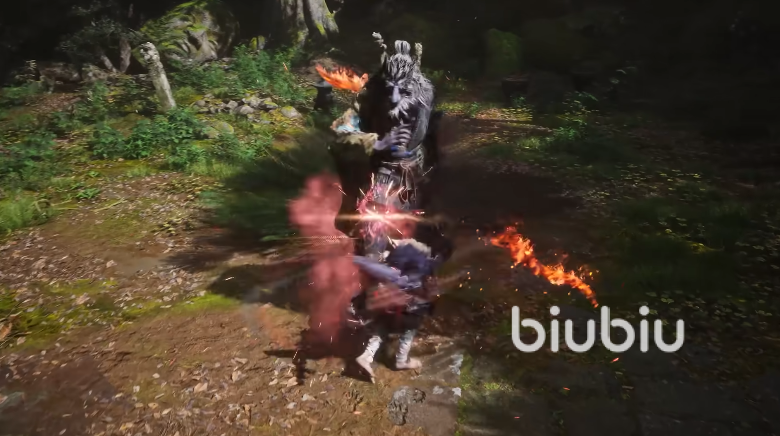 赤髯龙在第一阶段时人形BOSS,使用了长柄武器,两头带火焰并且会试图凭借武器的攻击范围来伤害到玩家。在他蓄力连招时,你可以立棍躲开,或是使用完美闪避来给自己的重击技能充能,在他收起武器时来进行攻击。反反复复以此来削减韧性,一直到BOSS进入第二阶段。