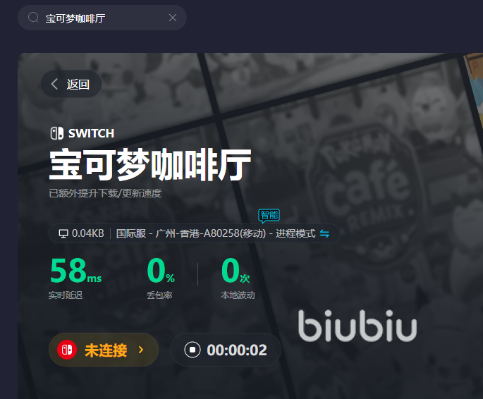 因为宝可梦咖啡厅当下是没有pc端的,是得通过Switch平台下载的,但biubiu还能检测到你的设备有没有连接成功,成功之后即可开启简单又快乐的加速时光,要是还有其他的主机游戏想体验,可以直接搜索名字,它能将主机和pc分类一下,也不难发现,biubiu是根据当前最优状态的节点来分配,还能看到进程模式和路由模式的切换。