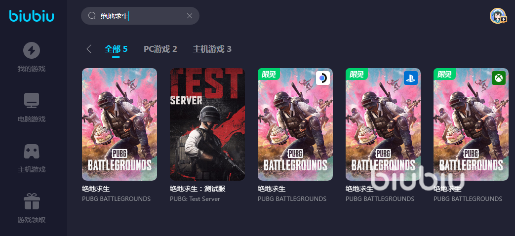 如果暂时不想玩绝地求生,想找一些新鲜的游戏来换换口味,也可以在biubiu里面搜索游戏,参考它强大的游戏资源,总有一款适合大家。平台还给用户免费赠送游戏,进入游戏领取板块即可领取。