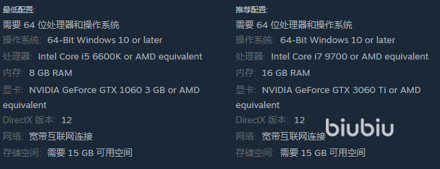 首先我们先来了解下它的最低配置的要求,只需要满足64位的win10系统、CPU是6代的i5、8GB的运行内存、显卡方面则需要达到3G显存的GTX1060或者同等性能的A卡的硬件,玩家们就能够以最低特效来运行此游戏了。