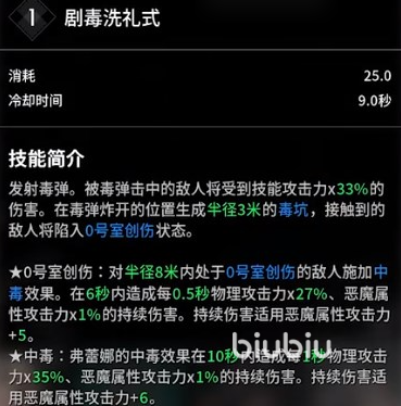 这个角色叫做弗蕾娜,她的技能基本的都跟毒有关。剧毒洗礼式是可以发射毒弹的,被命中的敌人受到的伤害会提高33%,另外毒弹炸开的位置会形成毒坑,半径3米之内的敌人都会进入0号室创伤的状态,该状态下会对半径8米之内具有同样状态的敌人,施加中毒效果。