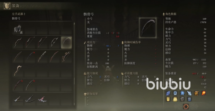 这把武器是属于小弓类型的,骸骨弓是以充满罹病气息的骨头制成的粗糙小弓,具有独特的怨魂射击战技,可以使附有怨魂的箭追踪敌人。它的射程距离是29,而物理攻击力为66(高),更多详情请大家阅读下图。