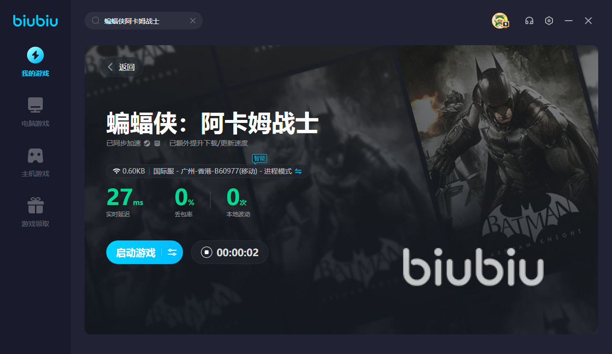 蝙蝠侠阿卡姆战士是款全球知名的漫改IP经典动作游戏,所以暂时没有国服。若是大家想前往哥谭市解决罪犯的话,那便需要使用biubiu。只有加速后才能进入哥谭市,不至于网络中断。新用户的话可领取24H的免费加速,让你先感受一下哥谭市里的氛围;另外新老用户可输入【biubiu不卡顿】,就能获取三天免费加速。在游戏中卡顿的话,那可能很难继续各种剧情,并无法完成探索任务。使用加速器之后,便可拒绝卡顿,让你化身蝙蝠侠自由穿梭在哥谭市里。