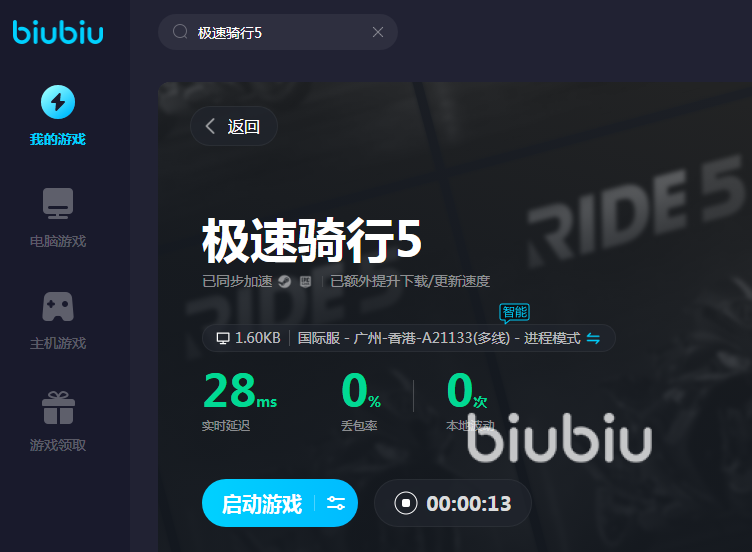 以上就是极速骑行5卡顿怎么办的内容了,希望可以帮助到大家。市面上大部分游戏的卡顿问题都适用本办法,安装好biubiu以后大家可以随时查看里面数以万计的游戏资源,不仅有经常玩的国服游戏,还能加速海外服游戏,想玩什么一点就能加速,方便得不得了。