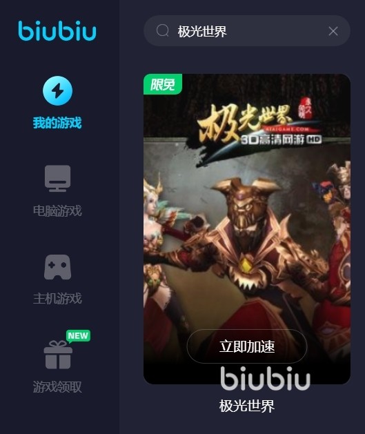 玩家在biubiu的游戏库内搜索【极光世界】这个游戏会发现这个游戏的图标上有【限免】的标识,这个标识的意思就是说这个游戏正处于限时免费加速期内,也就是说玩家对这个游戏进行加速的话是不用支付加速费用的。推出【限免】游戏也是biubiu的一个亮点,加速器会不定期的推出一些限免游戏,这些游戏会涉及多个端口,不仅仅是端游或者是手游,也有可能是主机类型的游戏,关于限免游戏的推出会在加速器官网上公布。