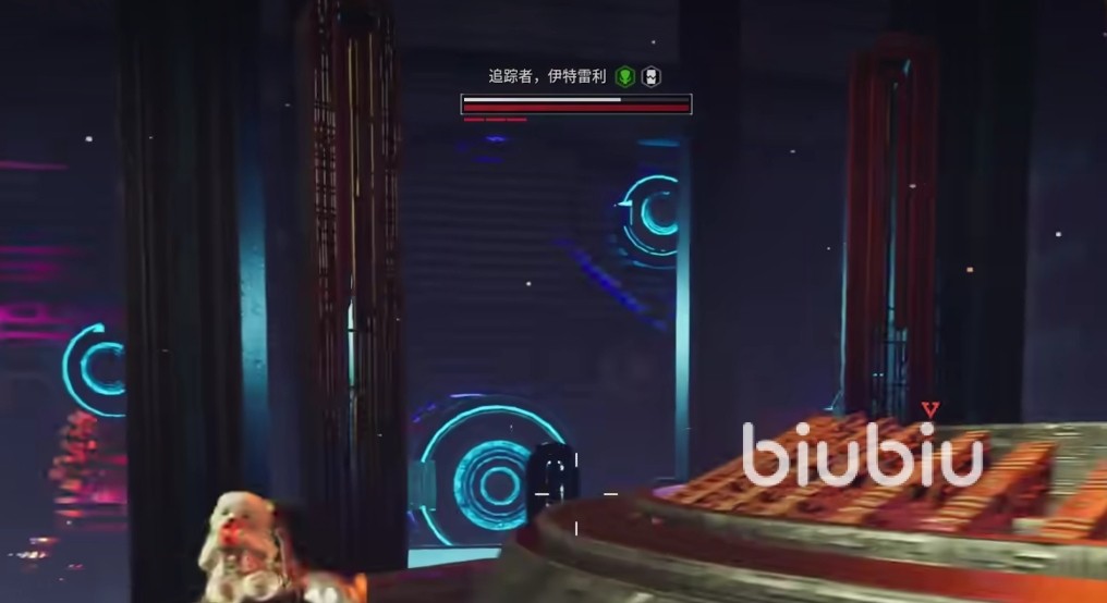 先来到中心有圆台的位置,这里是有一些小怪的,逐一清理掉之后吸引boss的仇恨。在它朝玩家移动的路上就开始射击,当打掉2/3白色血条的时候,怪物就会召唤护盾来保护自己。