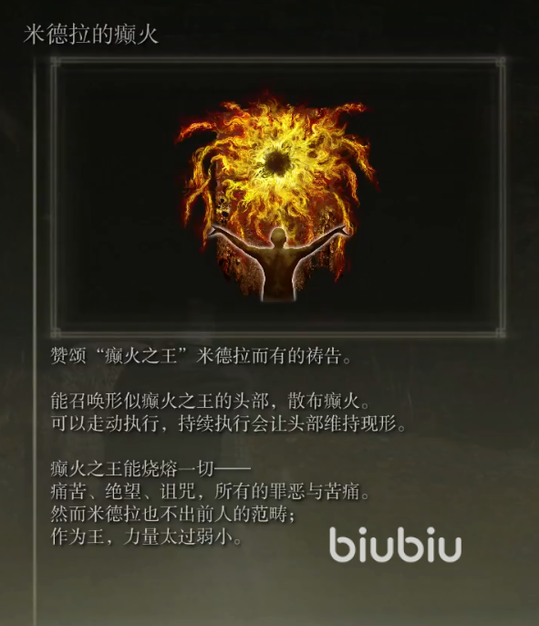 那么既然本身就是火焰大剑了,为什么不再配一个火焰祷告呢?玩家去幽影之地的谷底森林南部,击杀掉隐藏BOSS癫火之王米德拉,就能用追忆兑换祷告,米德拉的癫火。靠近敌人用大剑火刀砍,拉扯敌人是用祷告放癫火,再带一个满强化的泪滴分身,BOSS战更是如虎添翼。