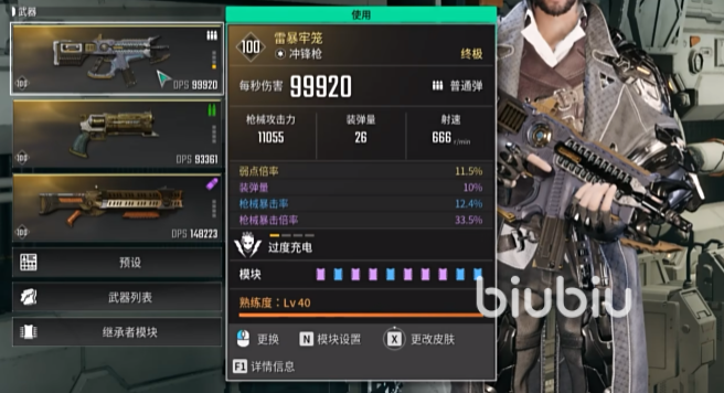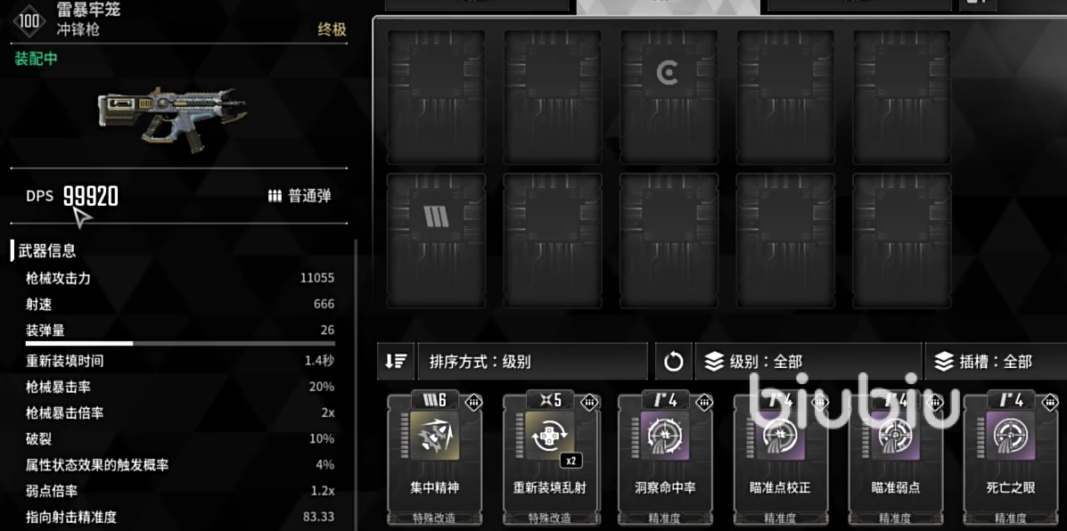 等级到达100级之后,我们就可以给它搭配好用的组件了,使用集中精神,装填乱射,瞄准点校正这些模块,是可以大幅度提升武器的属性跟攻击效果的,加成很大。