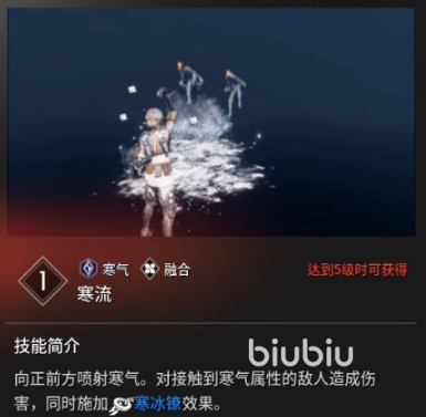 技能3寒流,维艾莎可以朝前方喷射寒气,可以对路径上的敌人造成伤害,同时附加寒冰镣效果。