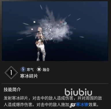 看完被动再来看她的主动技能,技能1寒冰碎片,角色可以发射寒冰碎片,击中敌人后造成伤害还能造成寒冰镣效果。