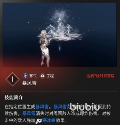 技能4暴风雪,在指定位置产生暴风雪,可以对暴风雪内敌人造成持续的伤害。在暴风雪结束后,还会再爆炸一次伤害,并对敌人附加一层寒冰镣的效果。