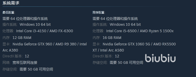 当我们的电脑满足了64位的win10系统、4代i3CPU、12GB的运行内存、显卡为GTX960或者是AMD R9 380、Directx版本为12这些要求以后,我们就能以最低特效去玩了。