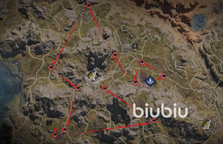 这个地方是一个山区地形,包含的道具还是很丰富,想要提高收集速度,可以根据小编给的路线图逐一搜集。从深草旅店出发,来到第一个点接取门扉任务,穿过正确的门之后就可以开启宝箱,拿到角型握把。然后前往第二个点位,在野外医院的二楼跟电话机互动,将旁边两个房间的道具摆放成一样,在走廊处宝箱里面就能拿到先进战斗光学瞄具。