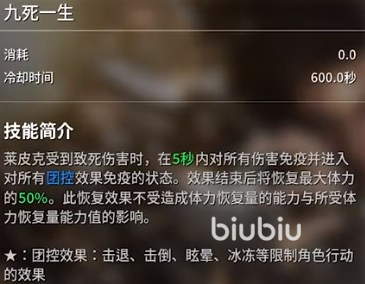 跟其他角色一样,莱皮克同样拥有四个技能。被动技能九死一生,当莱皮克受到致命伤害时,就会在5秒的时间内对所有技能进行免疫,时间结束后还会恢复最大体力的50%。