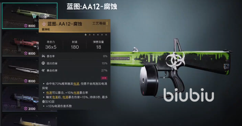 霰弹枪推荐:这里推荐大家兑换AA12腐蚀,需要8000星之彩。腐蚀可以触发电涌,而电涌在内测期间被加强过,这让腐蚀变得很强,在伤害上是不输上面的大白鲨的。如果大家想玩霰弹枪的话,就换腐蚀可以了。同价位的还有猎枪厄运宣告和DP12金钱雨,这两把枪是不建议兑换的,因为他们的实战表现很糟糕,效果是远不如腐蚀的。
