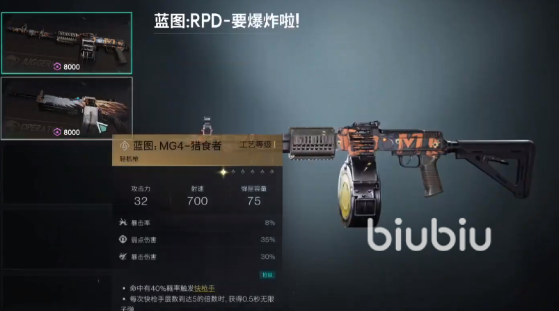 轻机枪推荐:轻机枪有两把8000价格的,分别是MG4猎食者和RPD要爆炸啦。这两把枪都挺不错的,大家都可以兑换,但是猎食者有快枪手的被动,要比要爆炸啦强上一点的。