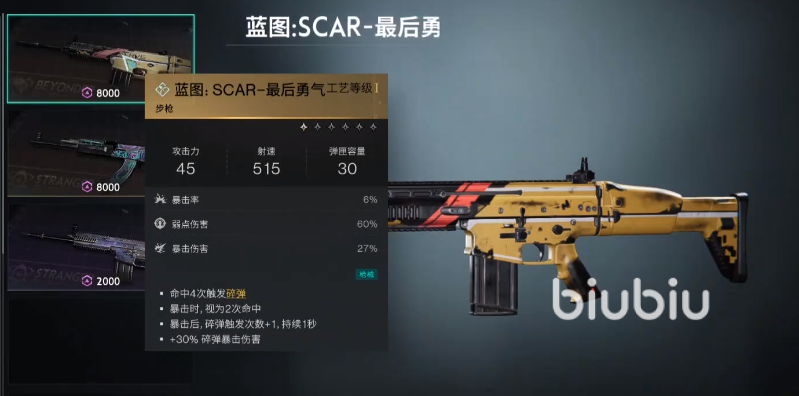 步枪推荐:建议兑换8000的SCAR最后的勇气,这把武器有碎弹伤害还是直伤,算是游戏中最强的武器之一了,如果大家不知道用什么枪的时候,用勇气就行了。另外还有一把AKM凝望深渊,这把枪也需要8000星之彩,但是整体强度稍逊于最后的勇气,所以建议大家换勇气。