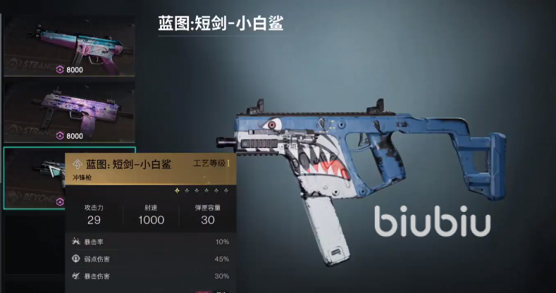 冲锋枪推荐:冲锋枪有3把8000星之彩的,其实这里都不太建议大家兑换,因为对比其他枪的表现并不算太好。首先是MP5熊来了,被动弹射打boss还是太弱了。而MP7外层空间和短剑小白鲨这两把武器,和免费获得冰雨冲锋枪强度一致,如果想玩冲锋枪直接选择冰雨即可,没必要花费8000来兑换。