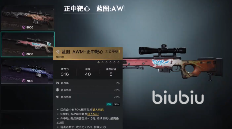 狙击枪推荐:狙击枪只建议换8000的AWM正中靶心,这把枪的强势之处在于猎人标记的被动,可以很好的增加其他武器的伤害。如果不想换正中靶心的话,也可以看看同价位的M82A1栗鸢,这把枪主要是弹射的效果,稍逊于正中靶心,但是玩法开发出来后还是可以期待一下的。