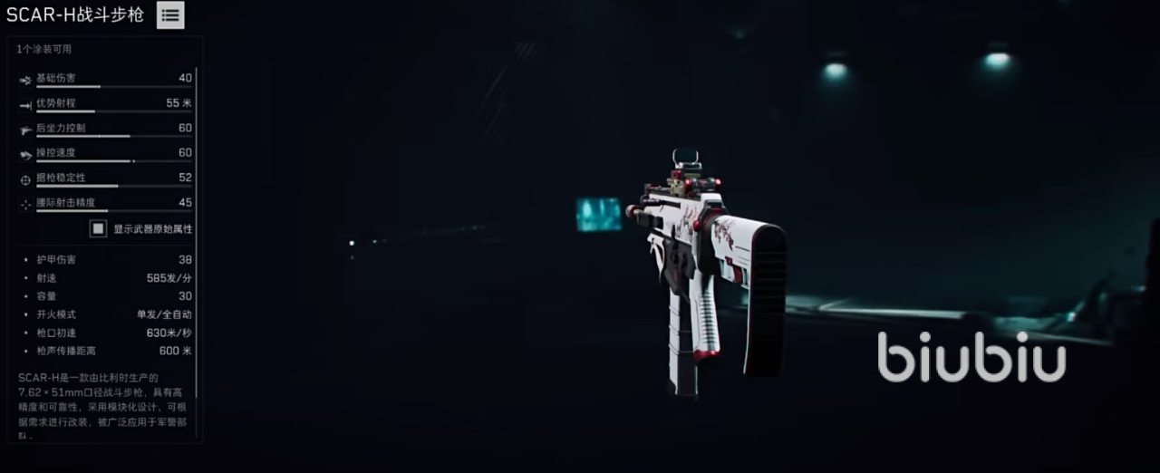 SCAR-H有相当高的基础伤害,在操控和后坐力上同样可以保持不错的表现,所以刚上手的话很容易熟悉。不过缺点也很明显就是射速600不到,这把枪更适合中距离作战,凭借自己的基础伤害优势来快速击杀敌人。