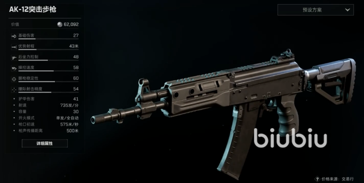 AK-12作为AK家族中的一员,继承了系列的一贯特点,就是在遭遇战中表现良好,27的基础伤害加41的破甲伤害,735的弹道初速可以让敌人在遭遇战中还没来得及反应就被击杀掉。不过这把枪的后座力比较大,如果敌人距离拉太远的话,可能你需要压一下准心位置。