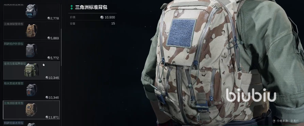 接着来到背包的选择就很多了,不过只有价格和容量的区别,这里选择大容量的就行了。胸挂的选择和背包一样,只有容量和价格的区别,大家看个人能力选择即可。但是背包和胸挂的区别小编要在这里讲清楚,背包在游戏内叫做普通存储空间,而胸挂叫做快捷使用空间,放在背包的子弹是不能快捷使用,只有放在胸挂和口袋的才能快捷使用。