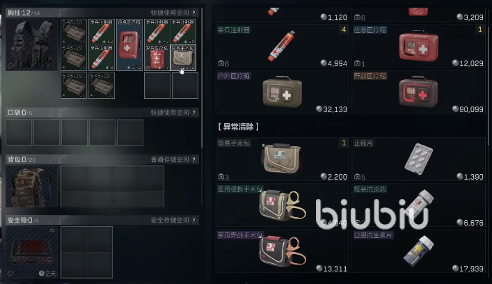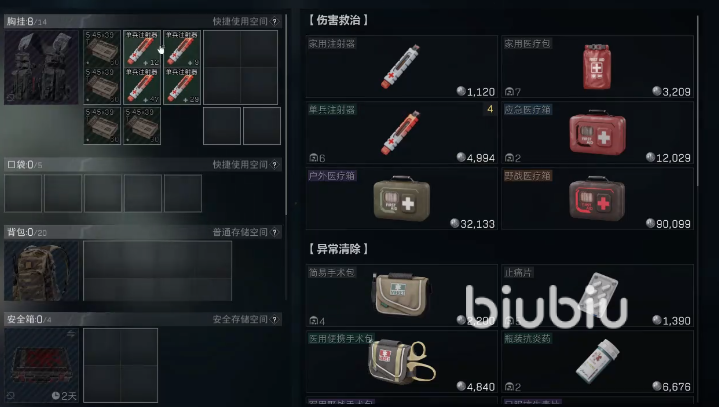 子弹采购完来到药品,药品作为作战环节中的重要一环,这里推荐大家携带单兵注射器,虽然血量回复少,但是注射快,不会拖延大家太多的时间。不用带多,一局比赛两根就可以了,带之前记得看下耐久度,耐久太低的话,用完就没了,这样在战场上就没持续作战的能力了。当然大家也可以选择大一点的医疗箱,使用时间相对长一点,不过回复血量多,具体看个人打法。