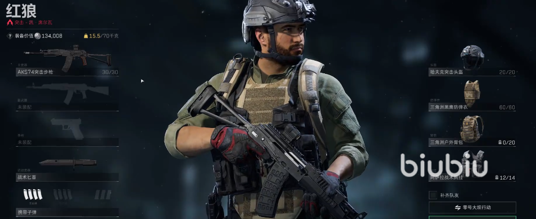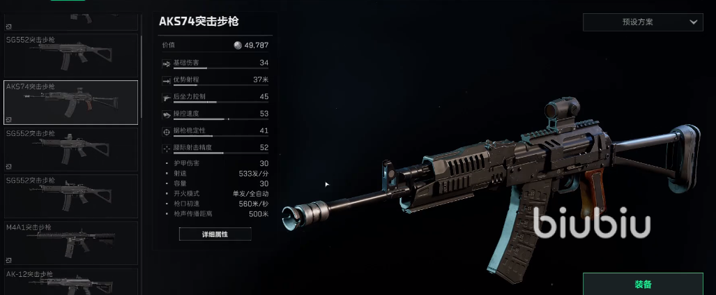 在穿着选择完毕后就来到了主武器,主武器前期推荐AKS74,算是一把性价比比较高的武器了。选择好主武器就来看下子弹,子弹分为五个等级,越贵的子弹穿甲能力越强,伤害也越高。前期新手的话,二级子弹就足够用了,因为子弹用量比较大。虽然单价差的不多,但是数量买多了之后,花的钱不比其他装备少。