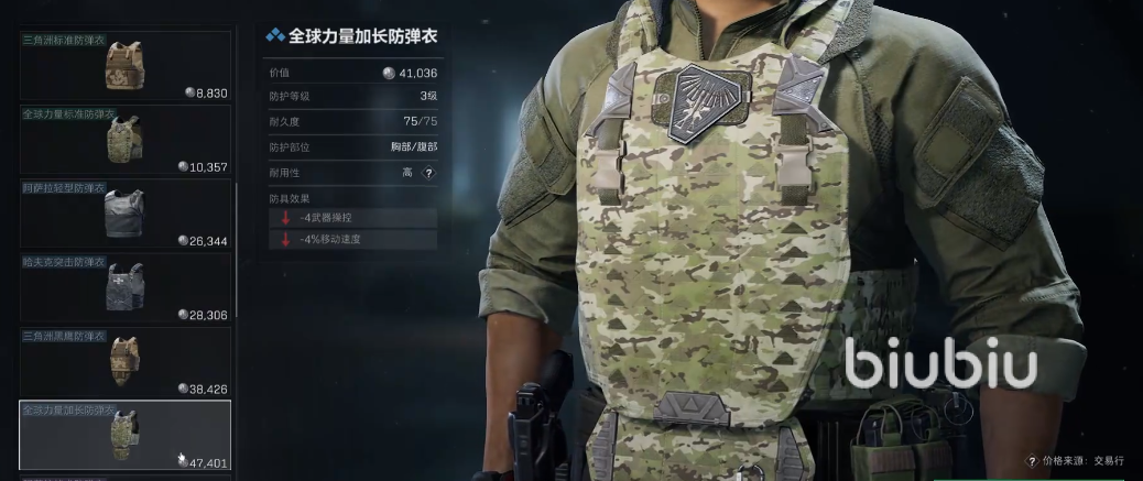 选完头盔来到防弹衣,防弹衣以3级位最优,商城中的选择还是很多的。主要以耐久、防护位置和防具效果三个标准,来判断一件防弹衣的好坏。好的防弹衣耐久度高,可以撑住一场战役不至于损坏。而防护部位则是越多越好,这样可以提升我们的生存能力。最后就是效果了,越贵的幅面效果影响越小,这里大家就根据自己的货币余额来看,建议不要花太多,因为后面还有很多要买的装备。
