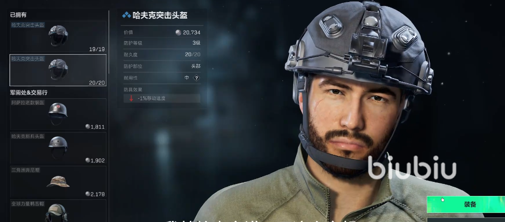 进入游戏主界面后,点击开始游戏,点击出发就会选择地图。这里随便选择一个地图,选择完成后进入配装页面,先从头盔开始配,大家按照所拥有的头盔来进行选择。最好选择防护能力高的,按照等级来说,等级越高防护能力越强,小编推荐三级头盔。但是选择时注意效果,有的会减移速,有的会减操纵,大家要选择一个适中的。