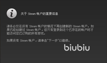 首先是在客户端注册,这时候我们只要正常打开平台软件,然后选择创建一个新的账户就可以了,点击之后就会跳出来重要信息,大概意思就是原有账户订购过的游戏是不会体现在新账户上面的。这时候我们点击下一步,然后阅读用户协议,点击同意即可。