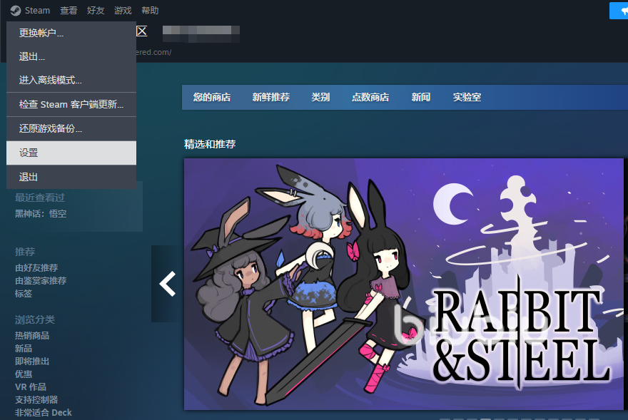 正常登录Steam之后,我们可以在界面的左上角看到有个Steam图标,点上去之后就会看到有菜单栏展出,选择下面的设置选项,就进入了全设置页面哦。这里会看到有很多选择哦,我们选第三个家庭选项,就可以看到右边跳出来了很多的设置栏。