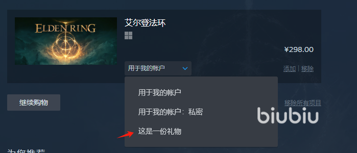 首先我们需要找到想要联机的游戏,加入购物车后在商品列表中找到这款游戏。我们可以看到在游戏页面下方,有一个可以下拉的选项,初始阶段显示的是用于我的账户,我们点击一下之后就能够看到其他的选项了。选择这是一份礼物,然后找到想要赠送的好友,确定好友信息无误之后,还可以输入一些祝福语,接着进行付款就可以继续赠送了。