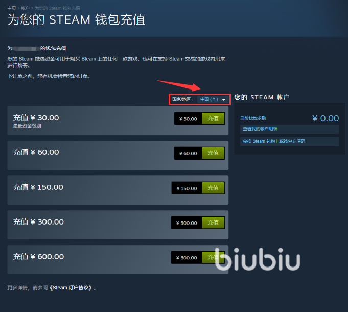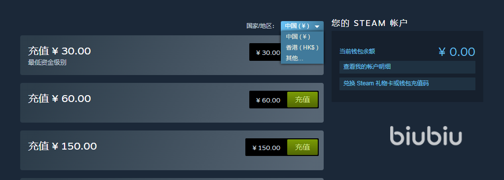 然后大家就看到的充值页面了,充进去的钱不仅是可以购买游戏,还可以购买其他的交易物哦。这里可以看到是有地区选项的,我们一定要选择好了,比如说大家现在是在国内玩游戏,所以选择的就是中国区,此时充值的货币自然就是人民币了。最低档是充值30元,更高档的充值是300元。
