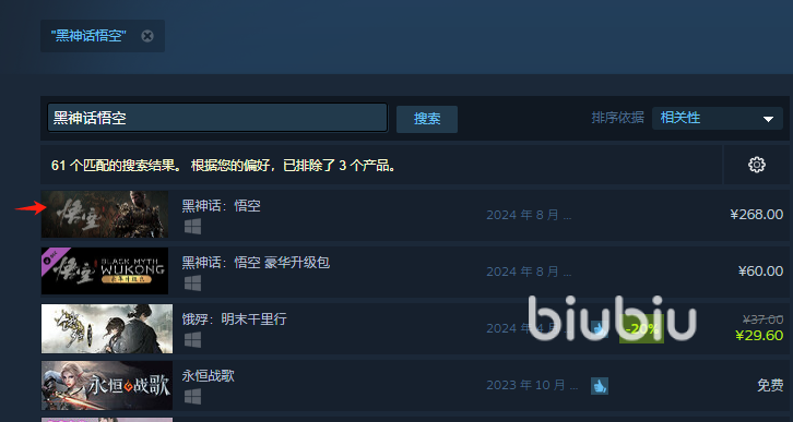 接着我们就可以去查找自己喜欢的游戏了,要是觉得大海捞针一个个看评论太麻烦,在biubiu的游戏专区这里是有新游资讯的。找到感兴趣的之后,我们就在客户端的首页,右上角的搜索栏当中,输入喜欢的游戏名,回车一下就可以找到了。比如说即将上线的黑神话悟空就很火热,这里小编就用这个做例子来查找一下。