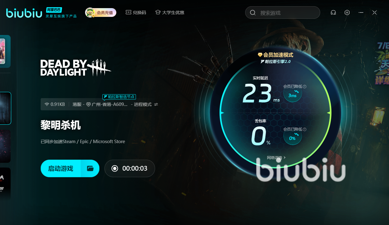 由于黎明杀机现在仍然木有国服上线,要是想与其他人一起交战。就得使用biubiu,合理优化网络后。才能令你在新的恐怖环境中开启猫捉老鼠的游戏,不过没玩过的话。新人可领取24H的免费加速,就可以试试;另外新老用户可输入【biubiu不卡顿】,便可领取三天免费加速。这样就能在好的游戏环境下继续开启屠戮。若是卡顿的话,那就不能继续走动。有了加速器之后,自然可以告别卡顿。让你安心启动游戏,而不是走两步就卡得动弹不得。