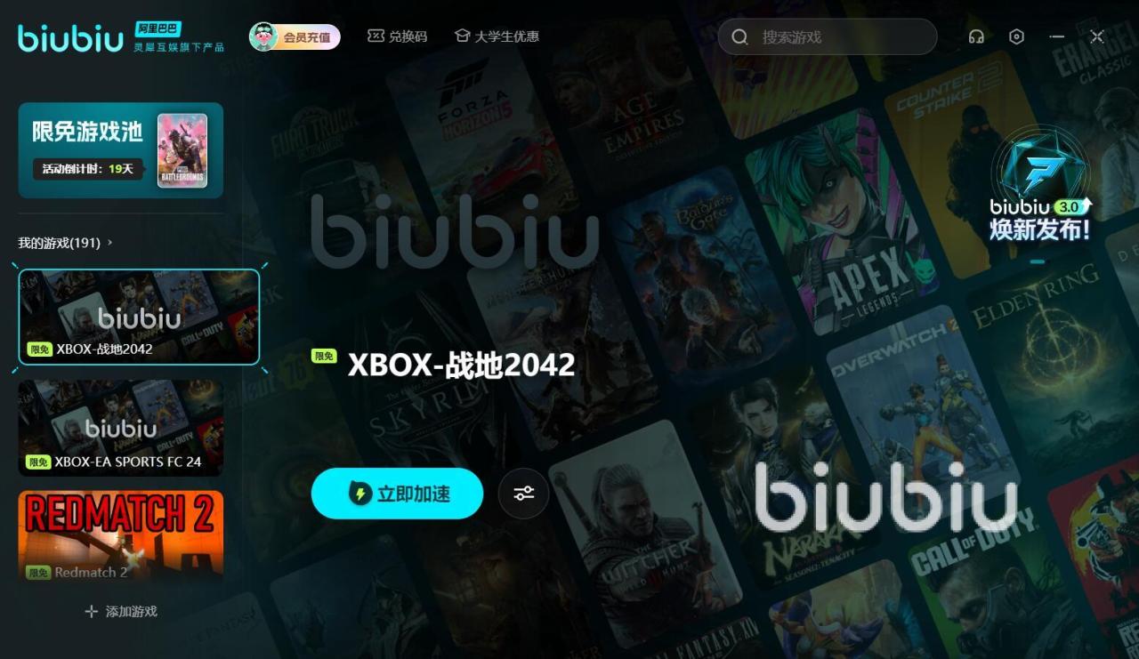 现在注册成为软件的新用户,能直接领取24小时的免费加速时长,此外,所有用户属于专属兑换码【biubiu不卡顿】,就可以领到3天的加速时长。