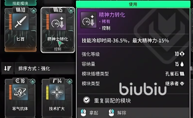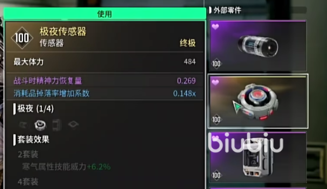 最后为了提高容错率,我们还需要提高蓝量。一是配备一个回蓝模块,使用精神力收藏家,在升满级之后,每次击杀敌人都会有17%的概率回复12.2%的最大精神力,等于弥补了蓝量的缺失,保证有足够的蓝用来放大招。二是可以使用外部零件,也就是极夜传感器,是可以提升战斗时候的精神恢复量的,双管齐下,保证大家的蓝量足够使用。