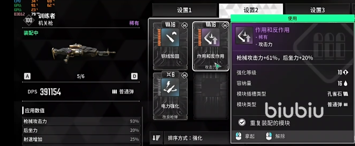 有了这个思路,我们在搭配技能以及装备的时候,就能明确的知道应该怎么做了。前中期的时候,我们武器可以选择训练者这个机关枪,然后配卡选择钢线加固以及作用跟反作用这两个模块,都是可以增强枪械的攻击力的。升级好了之后,提升是可以达到70%的。