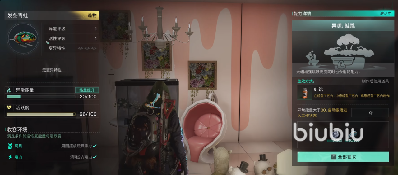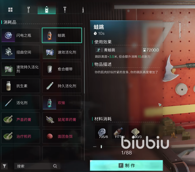 而用处方面,它对战斗没有帮助,而是会解锁一个消耗品叫做“蛙跳”。玩家可以在烹饪台进行制作,制作完使用之后,会在一定时间内增加3.5米跳跃高度,但会额外消耗15点耐力,如果你想探索某些高处,它倒是比较有用。