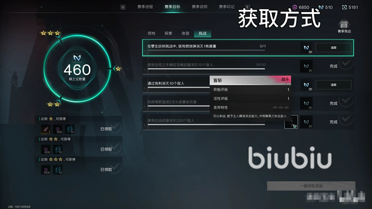 除了通过大世界探索获取皆斩外,玩家还可以通过完成赛季挑战目标来获得。在赛季挑战中,有一个特定的目标是使用近战武器消灭200个敌人,一旦玩家成功达成这一目标,即可直接获得名为皆斩的收容物。