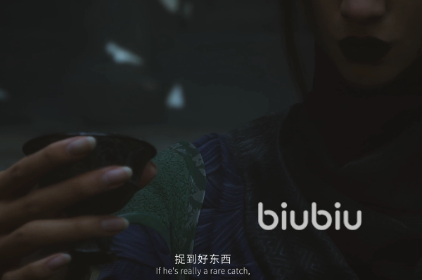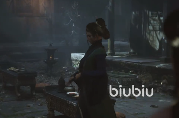 从四妹的第一次登场开始,镜头通过她的一个越肩视角给到她的三位姐姐,还有一个可能被隐身掉的模型,那就是我们的游戏主角天命人。此时她的姿态是坐在手里把玩着杯子,可以看出她明显是一个审视的姿态。这时大部分人会有一个比较下意识的反应,那就是一般以这种姿态出场的,在剧情上来看不管她是正派还是反派,都会是相对比较重要的人物。