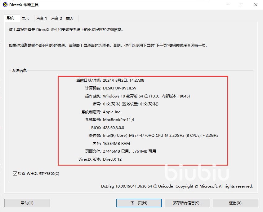 遇到这个bug通常是电脑配置不足的问题。通过本机设置或第三方检测软件查看电脑配置,包括CPU、内存、显卡等关键硬件信息,与Steam的最低系统要求进行比对。查看本机配置直接同时按住【win+R键】打开【运行】,输入【dxdiag】,点击确定,进入DirectX诊断工具。之后就可以看到当前电脑的基本配置信息了。